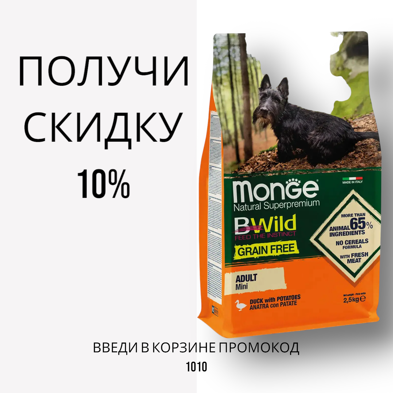 MONGE GRAIN FREE ADULT MINI CON ANATRA E PATATE — це повноцінний збалансований беззерновой раціон для дорослих собак дрібних порід, схильних до алергічної реакції на глютен. Корм виготовлений з м'яса качки з додаванням картоплі. Формула містить М. О. S і Х. О. S, що допомагає зберегти природний баланс кишкової мікрофлори і сприяє оптимальному засвоєнню поживних речовин. Раціон, збагачений омега-3 і омега-6 жирні кислоти для краси вовни і здоров'я шкіри.